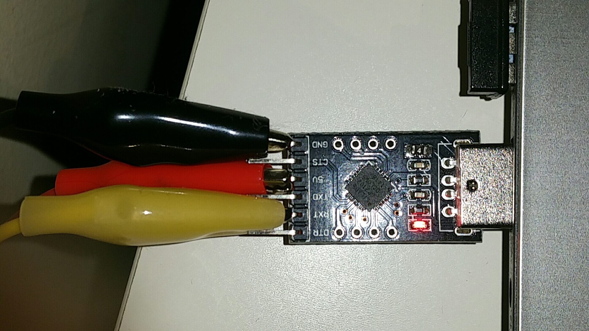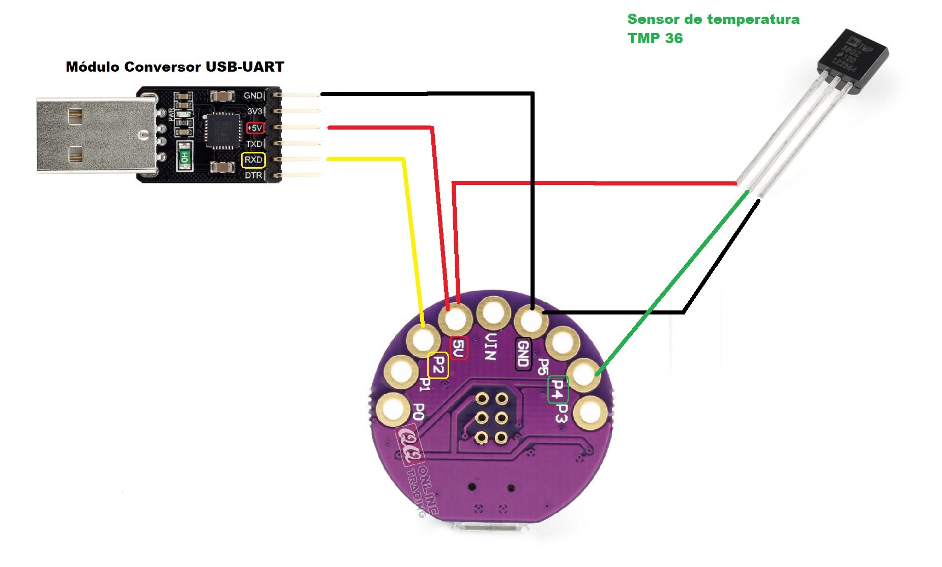 Una vez subido el código código, desconectamos la placa, conectamos el conversor USB-UART que debe ser reconocido en un puerto COM y realizamos las conexiones tal y como se describen en el esquema. Es importante que el pin RX del conversor se conecte al P2(TX) de la LilyTiny.