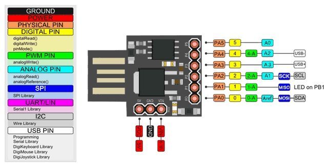 Aquí tenemos el Pintout de Digispark coincidente con el de esta placa: