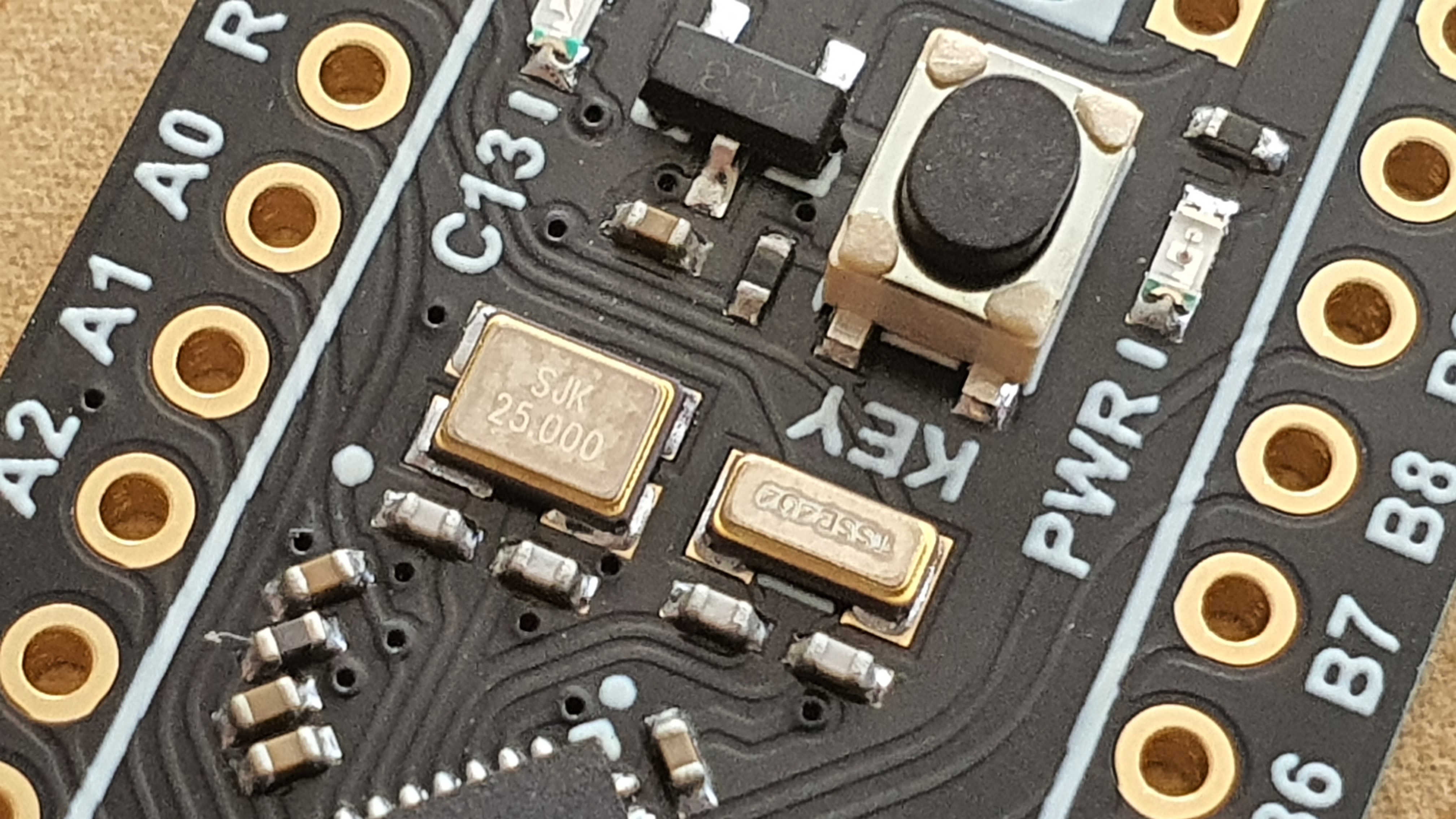 En la imagen de la izquierda podemos ver la rotulación del chip. En la imagen de la derecha podemos ver la rotulación del oscilador externo, en esta imagen de 25Mhz.