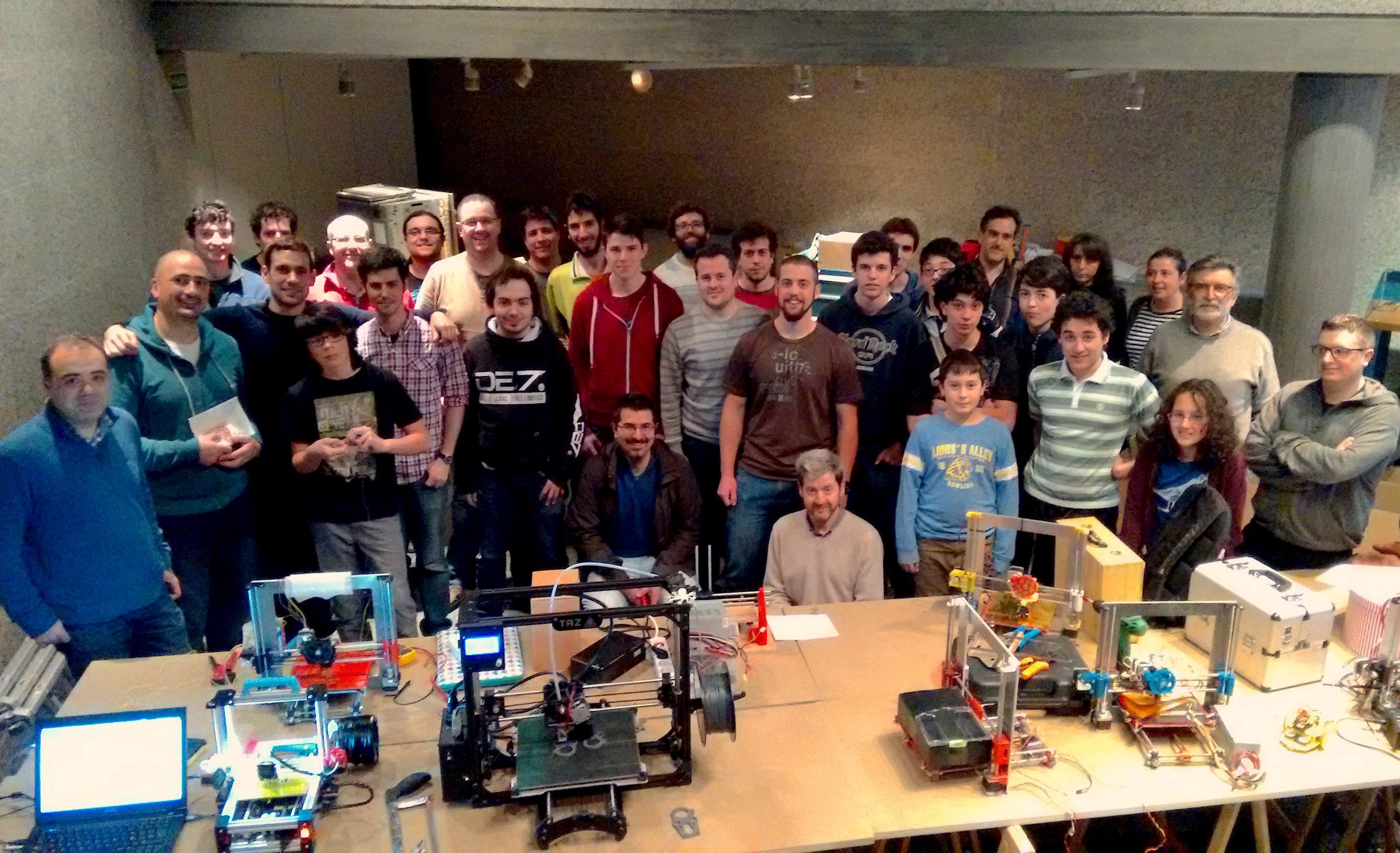 Foto de grupo mientras que la impresora imprime una de las patas del bicho que tiene encima.