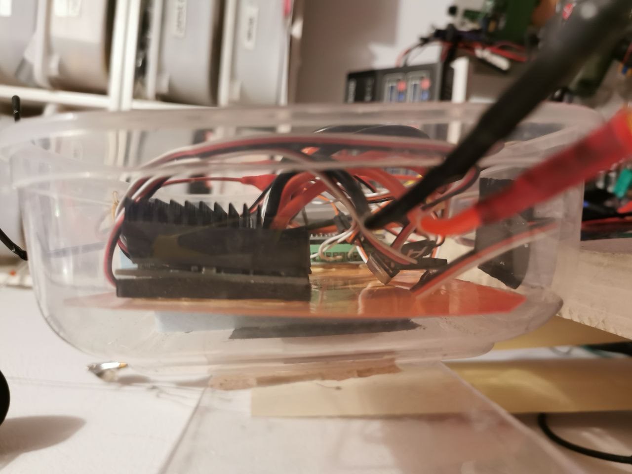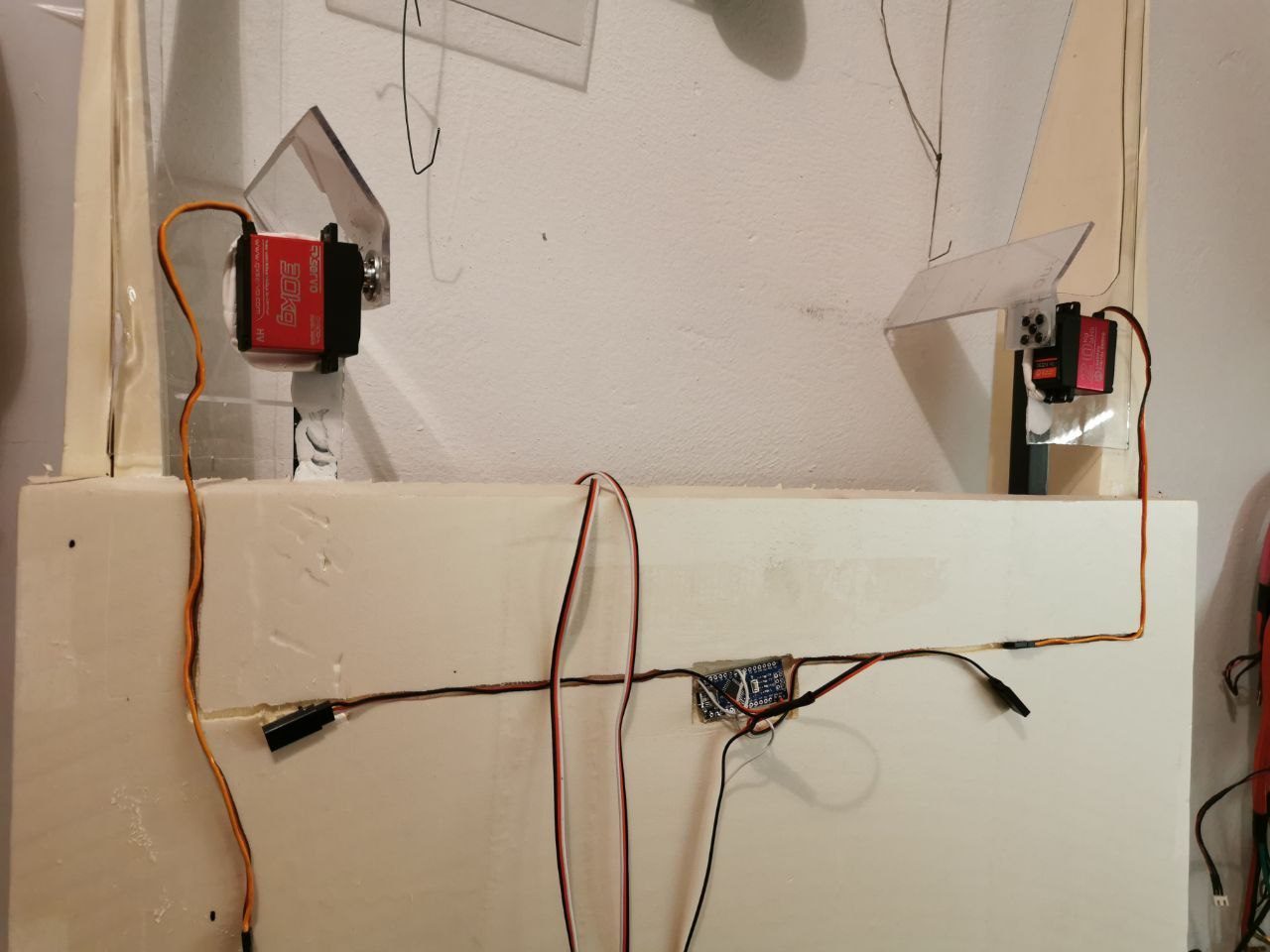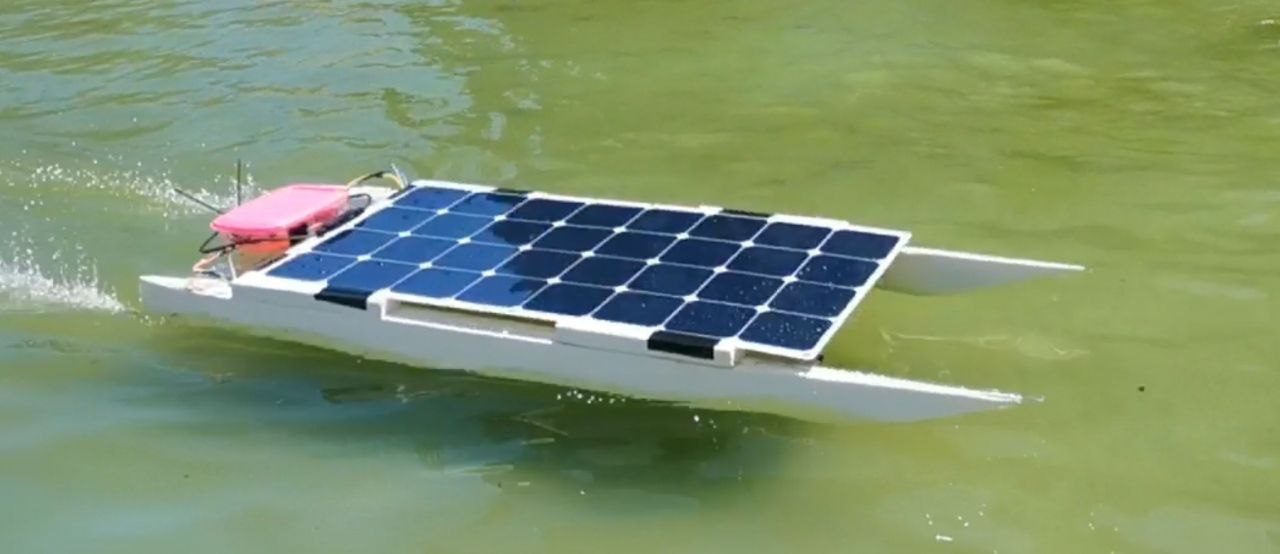 Los dos motores son de escobillas de 5 polos de muy bajo consumo que alcanzan unas 8000rpm a 18v , la emisora utilizada es de volante (radiolink RC6GS) pero con hasta 6 canales y realiza la mezcla de dirección y aceleración para mover los dos motores de manera diferencial a través de los canales 1 y 2 por el tercer canal se envía una señal de ajuste de la profundidad de los timones de dirección y en el cuarto la señal de dirección sin mezclar para el Arduino nano delantero. El sistema de control de la potencia procedente del panel solar se encomienda a un esp32 que únicamente vigila la tensión del panel a través de un divisor de tensión para no dañar la entrada , y atenúa las señales de control de los variadores de velocidad de los motores, solo si la tensión baja de 18v . Para la alimentación de la parte lógica hemos prescindido de las pilas y los sistemas de alimentación bec de cada variador de velocidad alimentan al receptor y el esp32 uno, el Arduino nano y los dos servos con el otro. El barco tiene un largo total de 1.6m y el ancho aproximadamente del panel situado longitudinalmente, pesa unos 4kg y en nuestras pruebas desarrolla una velocidad máxima de unos 5 nudos.