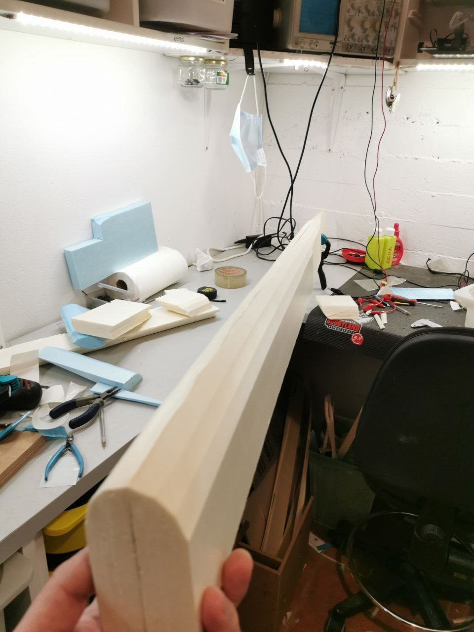 A la izquierda podemos ver la caja con varios hilos de nicron para aproximar la curva del casco.