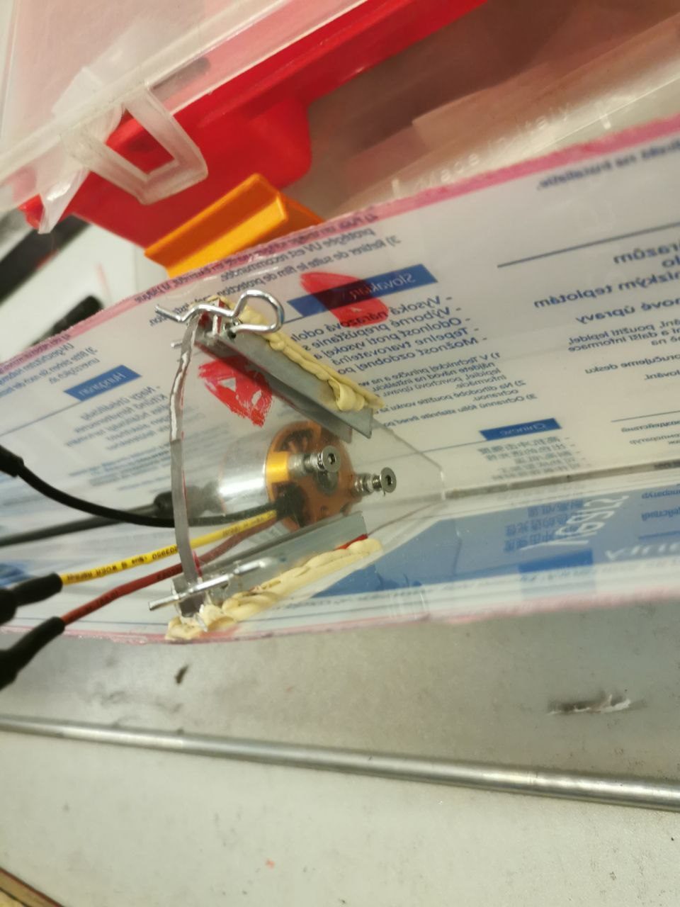 Unas costillas de policarbonato abren las láminas por el centro dándole cierta forma de canoa. Miden lo mismo que el panel (1m de largo) y 10cm de alto aproximadamente. Las «cubiertas» se han tapado con un plástico de forro de libros y cinta americana. Los motores están soportados por unas bancadas intercambiables también de policarbonato, pero de 3mm de espesor, alojadas en unos pequeños perfiles de aluminio en forma de U y bloqueadas con unos clips de carrocería para poder ser extraídas con facilidad.