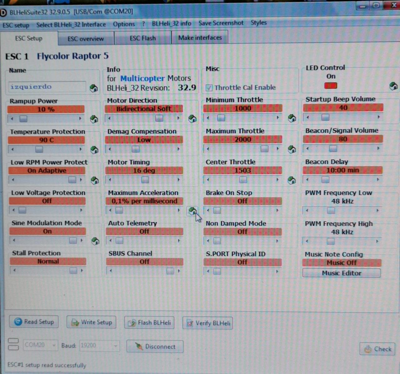 Los motores son outrunner 2212 de 930kv y están fijados por dos tornillos intencionadamente sueltos para permitir los cabeceos en los cambios de velocidad sin forzar la fricción en los ejes, que son de carbono de 4mm de diámetro y unos 30cm de largo. Los ESC son Blheli32 de 50A por arrancar suavemente. A continuación, una imagen con sus parametros.