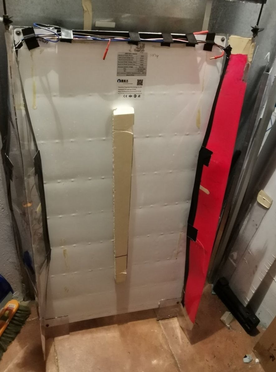 Abajo (vista inferior): pegamos un trozo de poliestireno extruido como flotador por si acaso teníamos una vía de agua. Al ser autoportante, para reducir la flexión del panel añadimos un perfil en L de PVC, similar al del enlace, que además aprovechamos para canalizar el cableado.