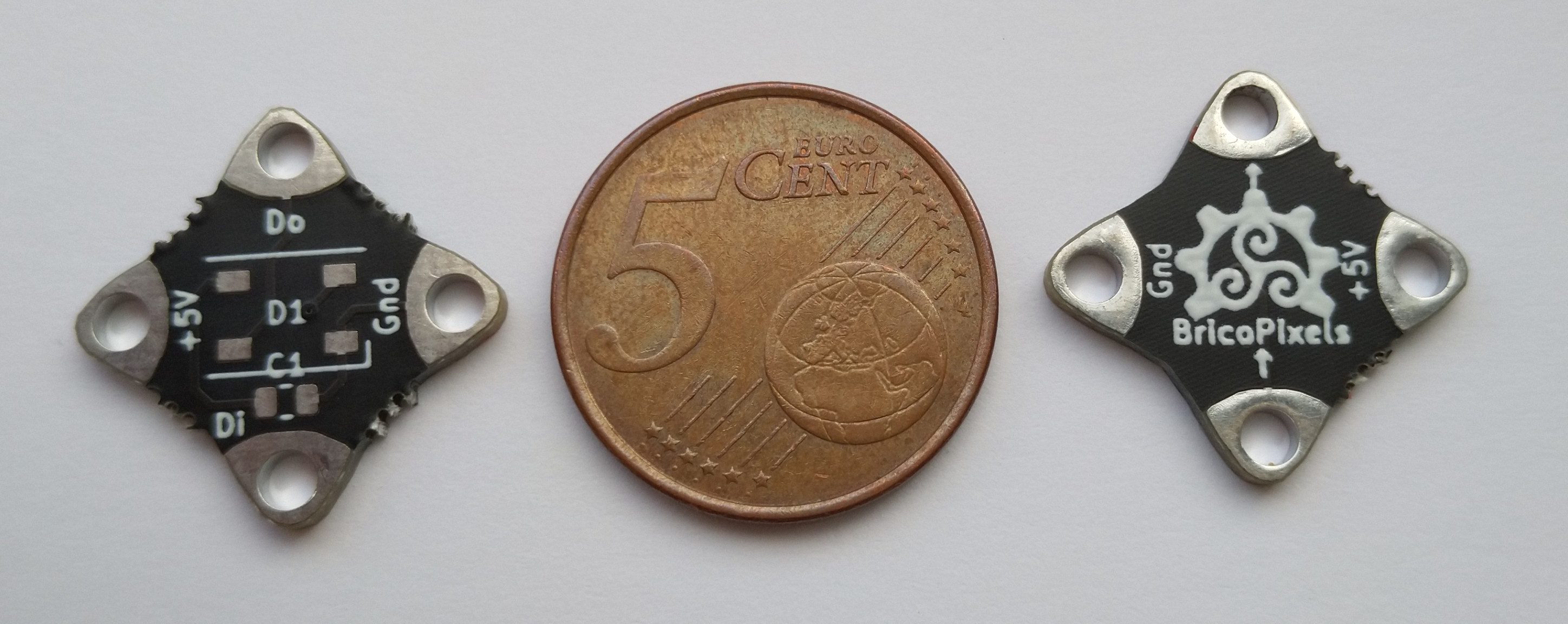 El diseño de BricoPixelLED está inspirado en el Flora NeoPixel v2 de Adafruit. El concepto original consistía en una forma ovalada con tres pads de entrada en la parte inferior del diseño (Vin, Sin, GND) y otros tres de salida en la parte superior (Vout, Sout y GND). Para reducir el tamaño y simplificar el diseño, y por tanto las puntadas necesarias para fijar el wearable, se opta por un diseño con forma de estrella de cuatro puntas con los bordes redondeados. BricoPixelsLED tiene un tamaño inferior al de una moneda de 5 céntimos de euro.